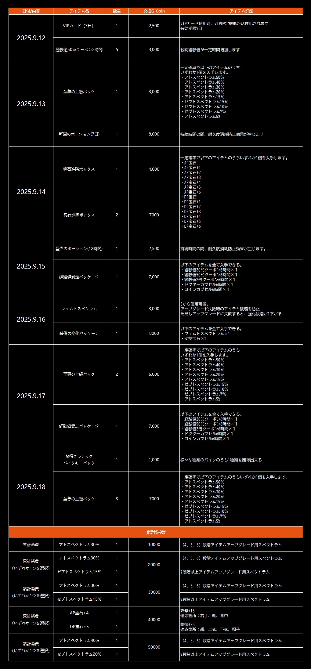 2025年9月11日(木)メンテナンス後 ~ 9月30日(火)メンテナンス前
